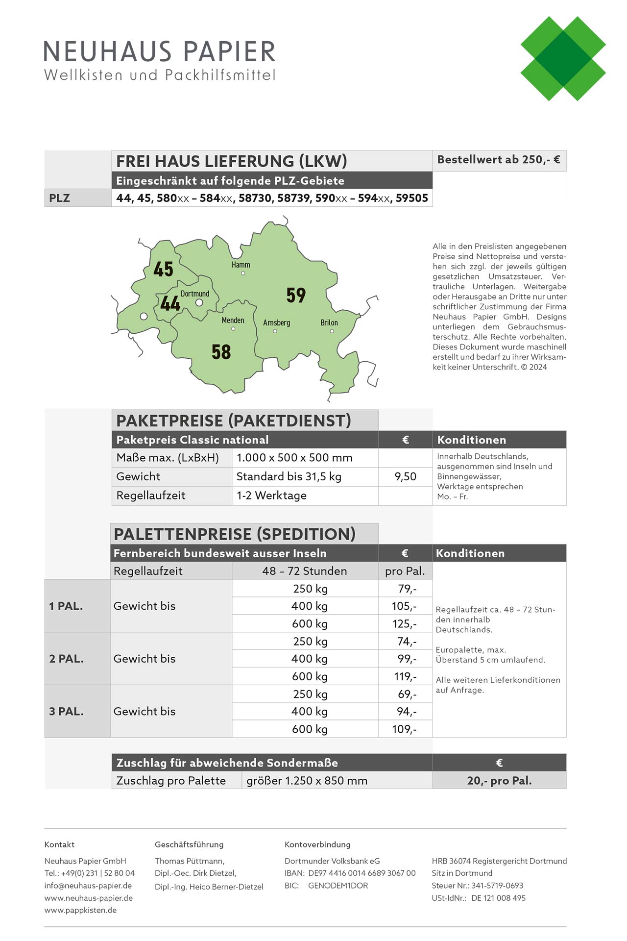 Download Frachtkosten für Paket- und Palettenzustellung. Alle in den Preislisten angegebenen Preise sind Nettopreise und verstehen sich zzgl. der jeweils gültigen gesetzlichen Umsatzsteuer.